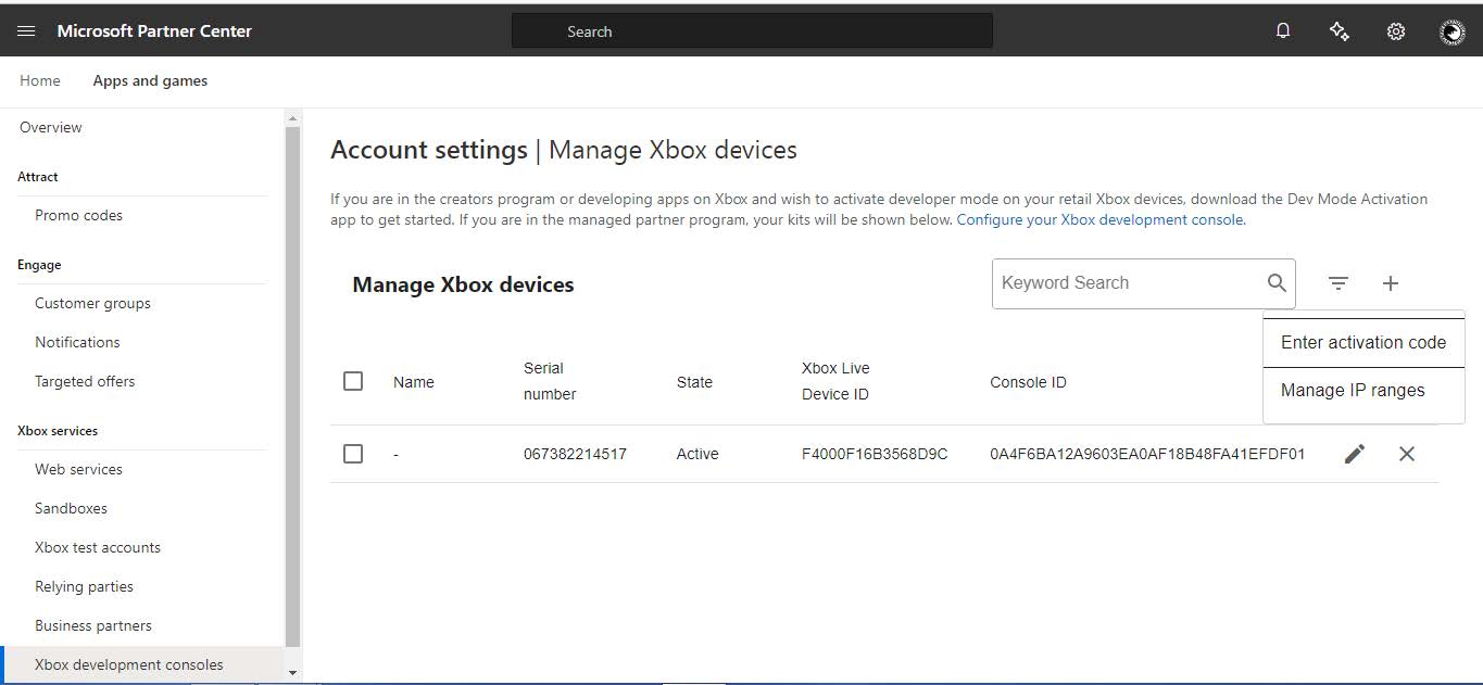 - Na página acessada através do link anterior, no canto inferior direito busque pela opção Xbox development consoles e abra a aba, onde você deve buscar pelo sinal de + clicar e digitar o código de ativação fornecido pelo console na etapa 4.